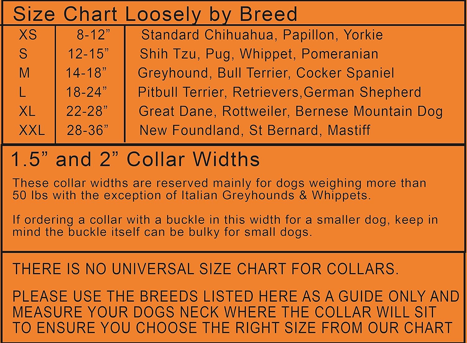 This collar features bright candy corn on a black background with glittery grey swirls. Your dog will be the most festive dog on the block in this collar! This collar is available in - 3/4", 1", 1.5" and 2" width collars. Also available in collar styles- Buckle side release collar, Martingale collar, and Martingale with buckle collar. Our collars are made with a 100% cotton fabric covering, nylon webbing core, welded metal hardware, and a contoured plastic buckle for 5/8" and 1" width collars. 1.5" & 2" buckle collars have flat buckles. Martingale collars are also known as Greyhound Collars or Humane Choke Collars. The Martingale Dog Collar was designed for Sighthounds (ie, Greyhounds, Whippets, Italian Greyhounds, Borzoi, Saluki, etc) because their necks are larger than their head and they can slip out of traditional side release dog collars; these collars have gained popularity as training dog collars with other breeds in the recent past because trainers prefer the humane choke aspects. A martingale with a buckle dog collar offers the easy on/off option of a standard dog collar with the increased functionality of the martingale loop. This option is great for very large dogs with large heads because you can take the collar on and off without readjusting it each time to fit over the head.. Please measure the size of your dogs neck before ordering. If your dogs neck measurement is on the border of two sizes please order the larger size, each custom collar is made to order. 2" width collars are mainly intend for big dogs. Add a matching leash to your collar order by adding on this item and we will send you a matching leash for your collar design. Our leashes are made with same nylon webbing and a metal clip. http://www.amazon.com/dp/B01BJ53E9S Our sizing is as follows: Small: 12"-15" Medium: 14"-18" Large: 17"-24" X-Large: 20"-29" XX-Large: 28-34" Search for Caninus Collars on-line to find reviews of our collars.